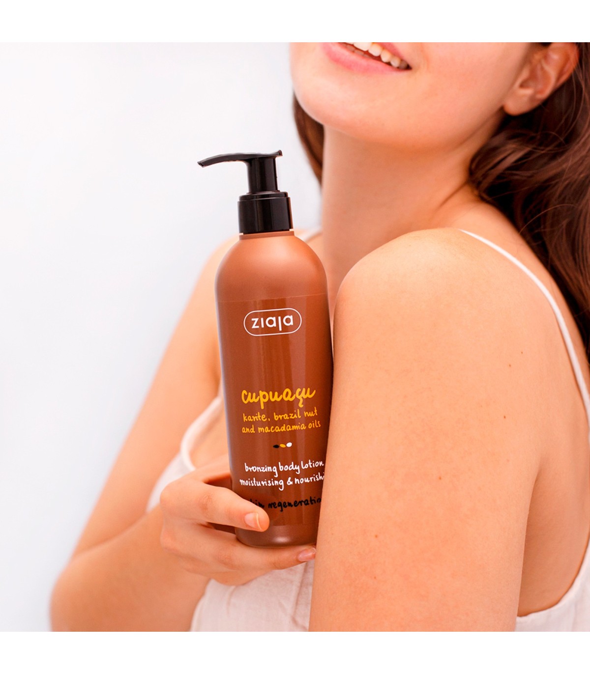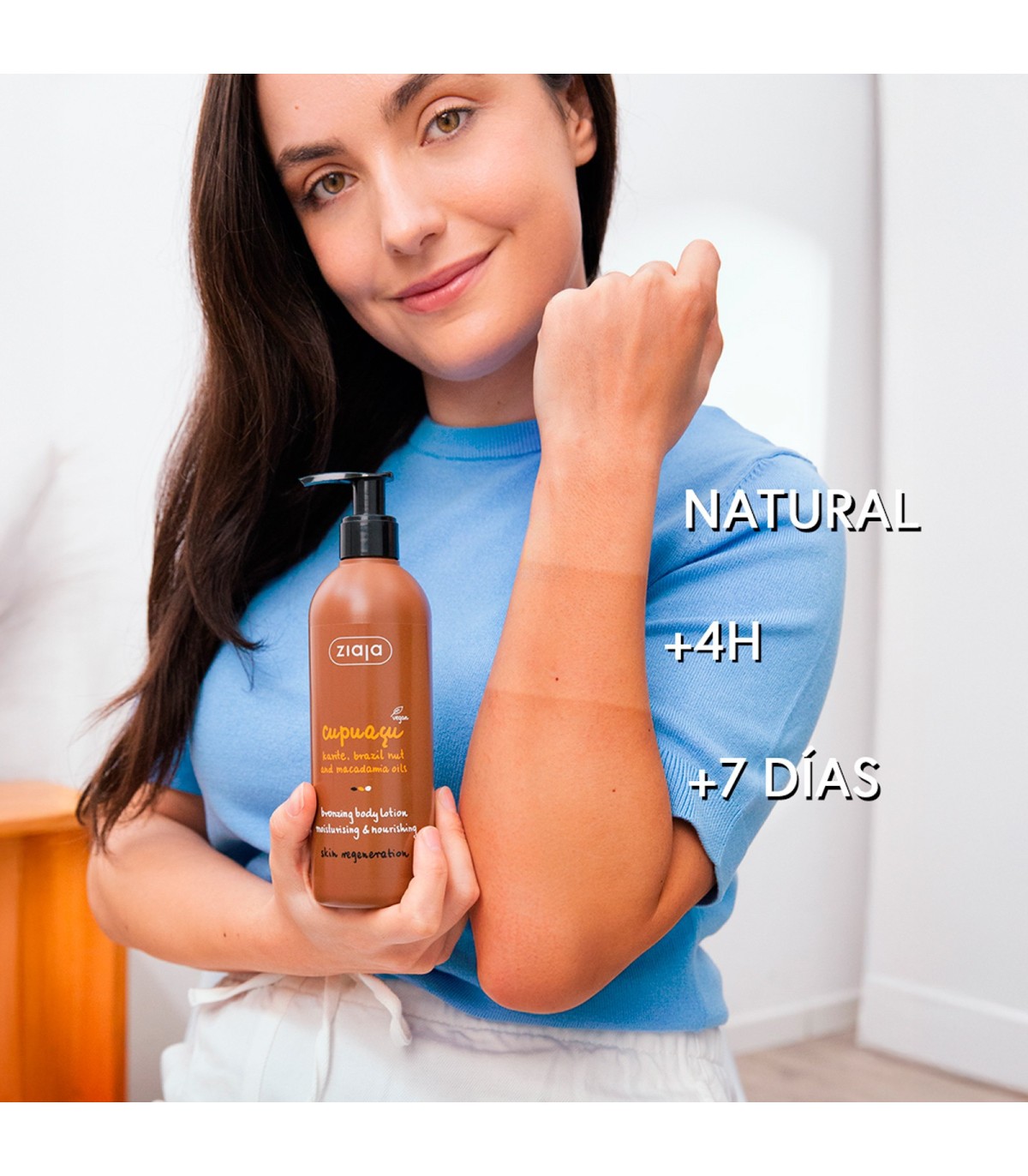 Ingredientes principales: manteca de cupuaçu, DHA de origen vegetal (dihidroxiacetona), aceite de macadamia, manteca de karité, aceite de nuez de Brasil.