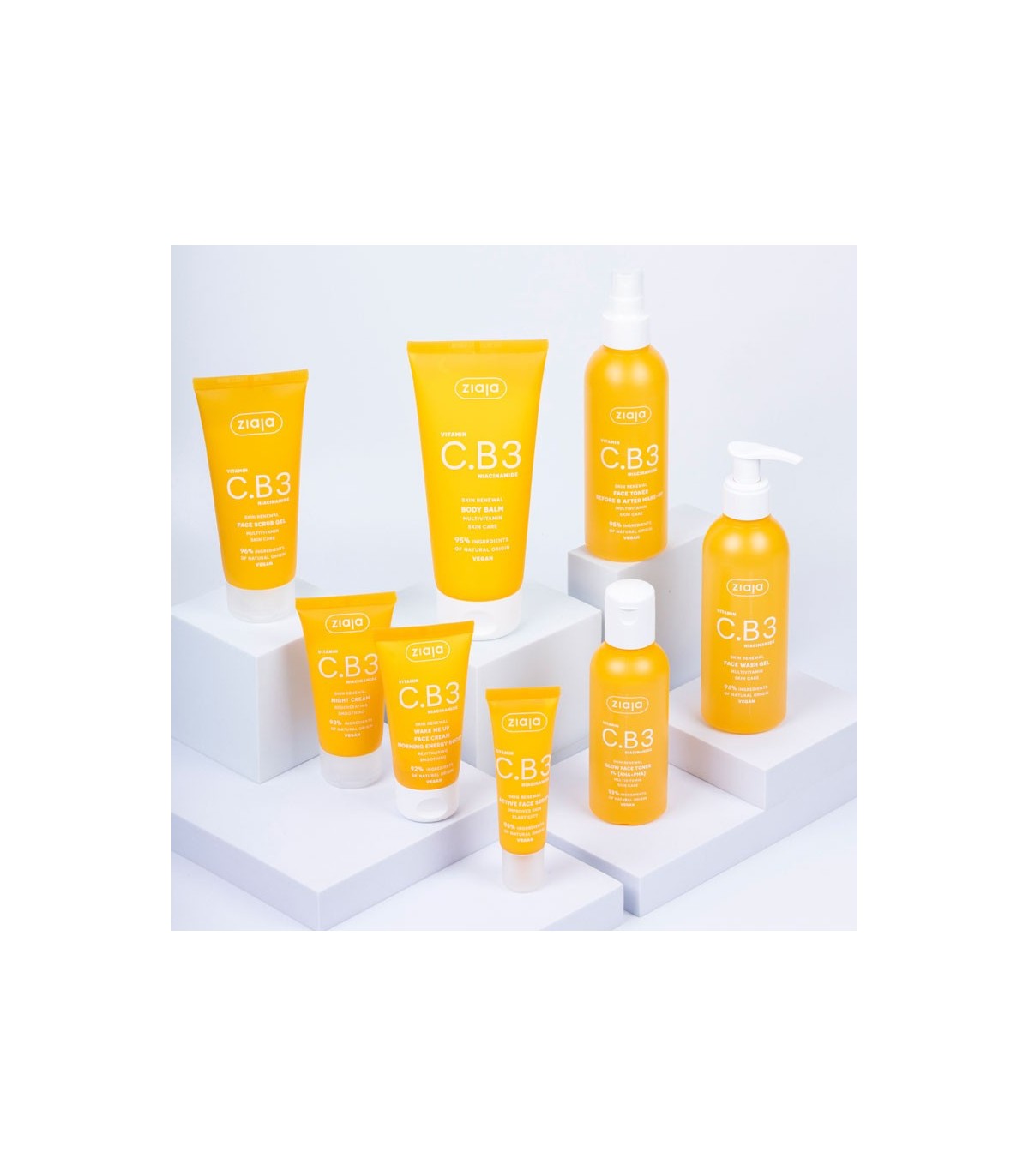 *Línea Vitamina C.B3 Niacinamida: Una selección de 8 cosméticos veganos para el cuidado del rostro y el cuerpo diseñados con la tendencia flash effect, es decir, una revitalización intensiva de la piel basada en rituales cortos y sin múltiples etapas que pueden realizarse por la mañana después de despertarse y antes de acostarse como parte de la regeneración nocturna de la piel.